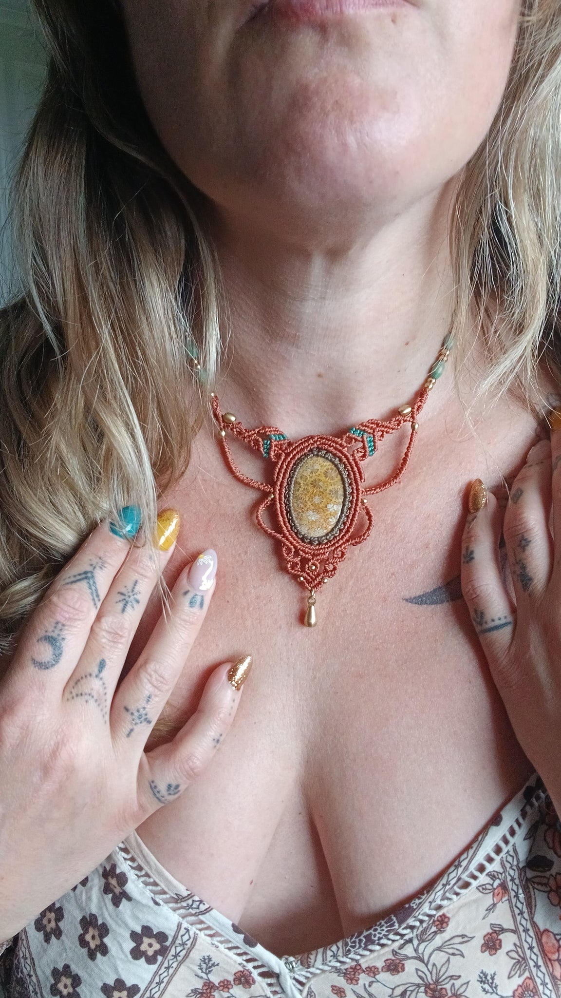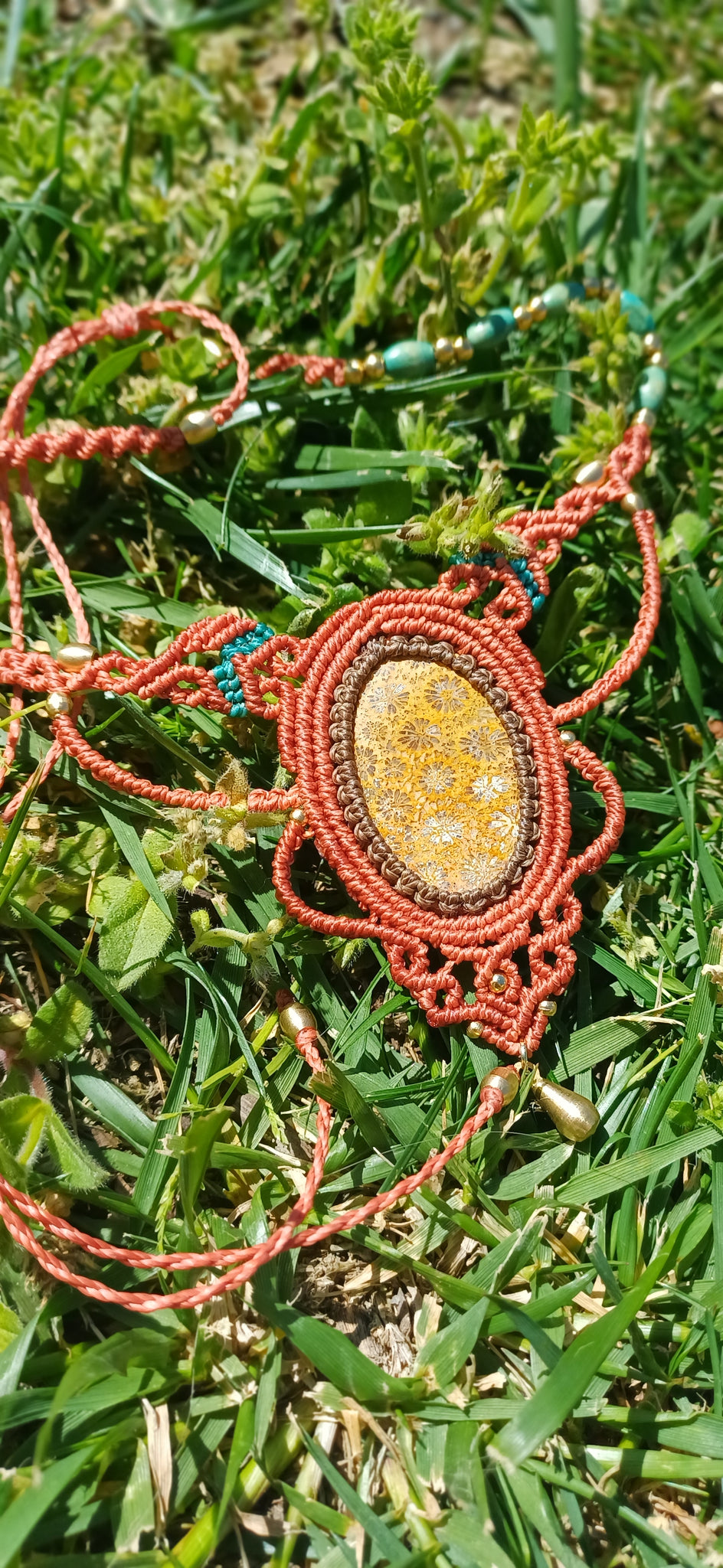 This radiant necklace features a vibrant coral centerpiece, intricately handwoven with warm, earthy macramé tones. Its sun-kissed design brings a burst of retro bohemian energy, perfect for adding a statement to any outfit.